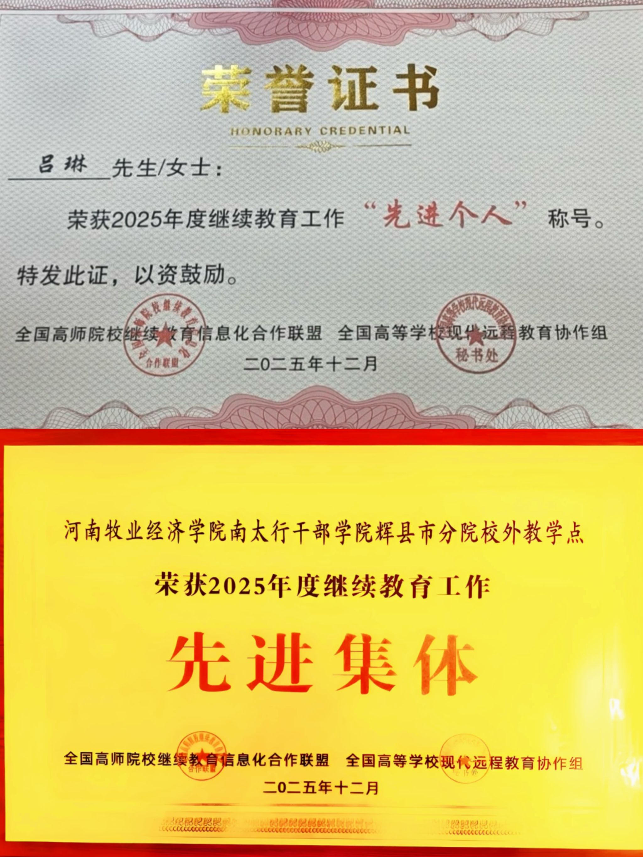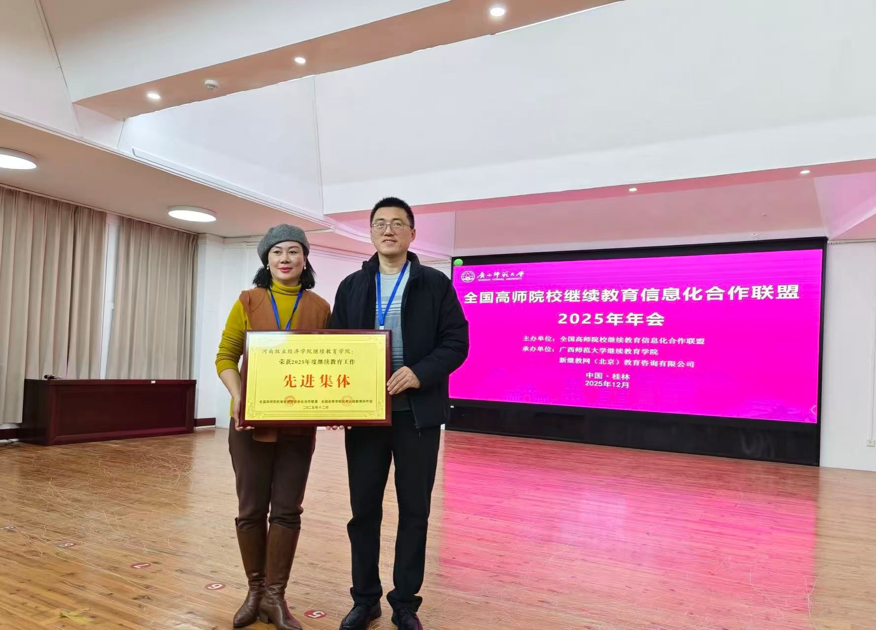 会上,教育部职业教育与成人教育司高等继续教育处副处长徐璐作指导报告。来自全国多所院校的继续教育负责人、专家学者齐聚一堂,围绕新时代继续教育的发展路径展开深入交流与研讨。 会议表彰了2025年度继续教育工作先进集体与个人。我校继续教育学院获评“2025年度继续教育工作先进集体”,吕琳副院长荣获“2025年度继续教育工作先进个人”称号。同时,我校校外教学点——南太行干部学院辉县市分院也荣获“2025年度继续教育工作先进集体”称号。